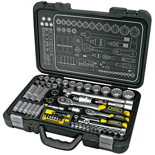 Gelenk-Umschaltknarre, Super-Feinzahnknarre, Steckschlüsseleinsätze mit Wellenprofil und Rändelung mit Doppelfinish, 5 Verlängerungen, große Auswahl an Bits und vieles Mehr.
