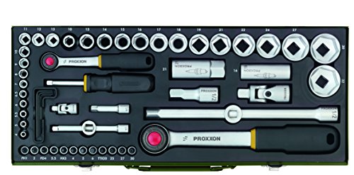 | Inhalt | 26 Steckschlüsseleinsätze,2 Zündkerzenspezialeinsätze,12 Schraubereinsätze, 5 Innensechskantschlüssel, 2 Ratschen in ¼“ und ½, 1 Schraubergriff, 3 Verlängerungen, 2 Kreuzgelenke |