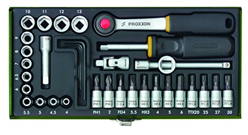 Gelenk-Umschaltknarre, Super-Feinzahnknarre, Steckschlüsseleinsätze mit Wellenprofil und Rändelung mit Doppelfinish, 5 Verlängerungen, große Auswahl an Bits und vieles Mehr.
